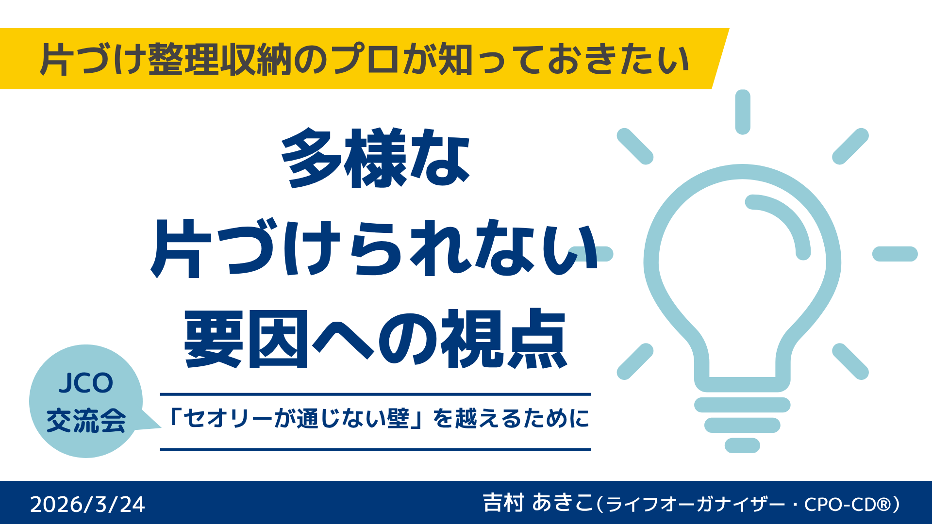 先日、2026年3月24日に開催されたJCO交流会にて、「多様な片づけられない要因への視点 〜『セオリーが通じない壁』を越えるために〜」というテーマで登壇させていただきました 。