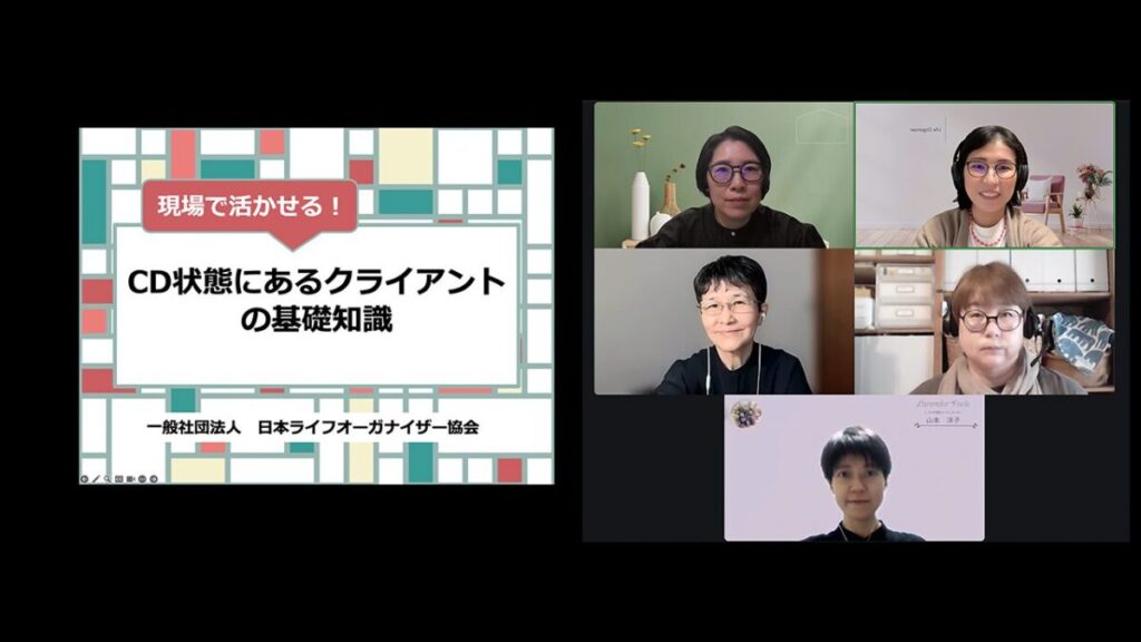 - 現在サポート中のクライアント対応に活かしたい(定期訪問しているお客様の今後のサポート方法を学びたい/整理収納アドバイザー向け講座以外の視点でCD状態の方への関わり方を知りたい)